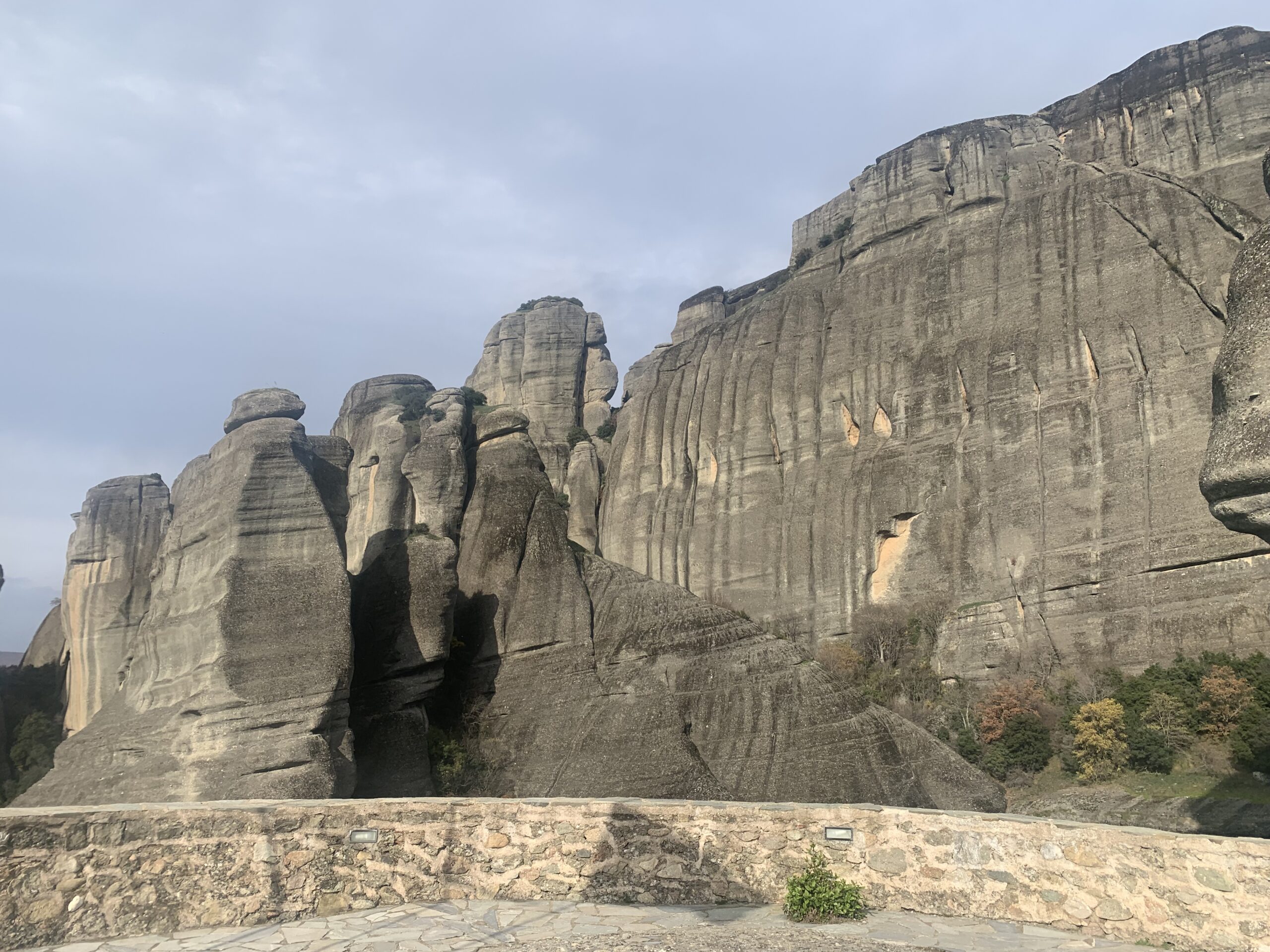 After breakfast, my brother drove to the Holy Monastery of Saint Barbara Roussanou, while I took videos of the drive up the mountain. He found parking easily on the side of the street. When we got out of the car, we saw a couple taking pictures across the street. We decided to see what kind of pictures they were taking and were surprised by the incredible viewpoint. From standing on the rock, we saw rolling rock formations and several monasteries.