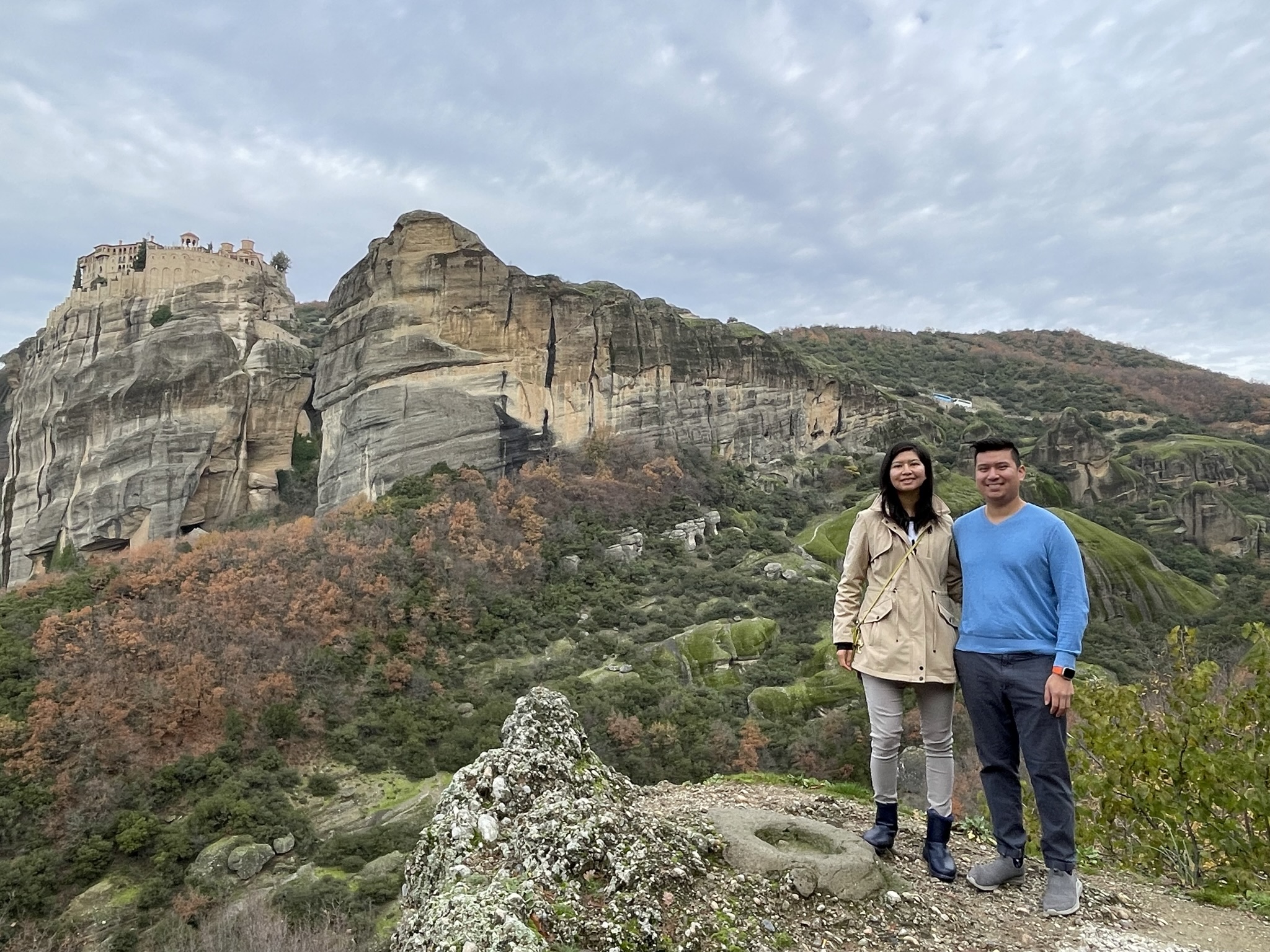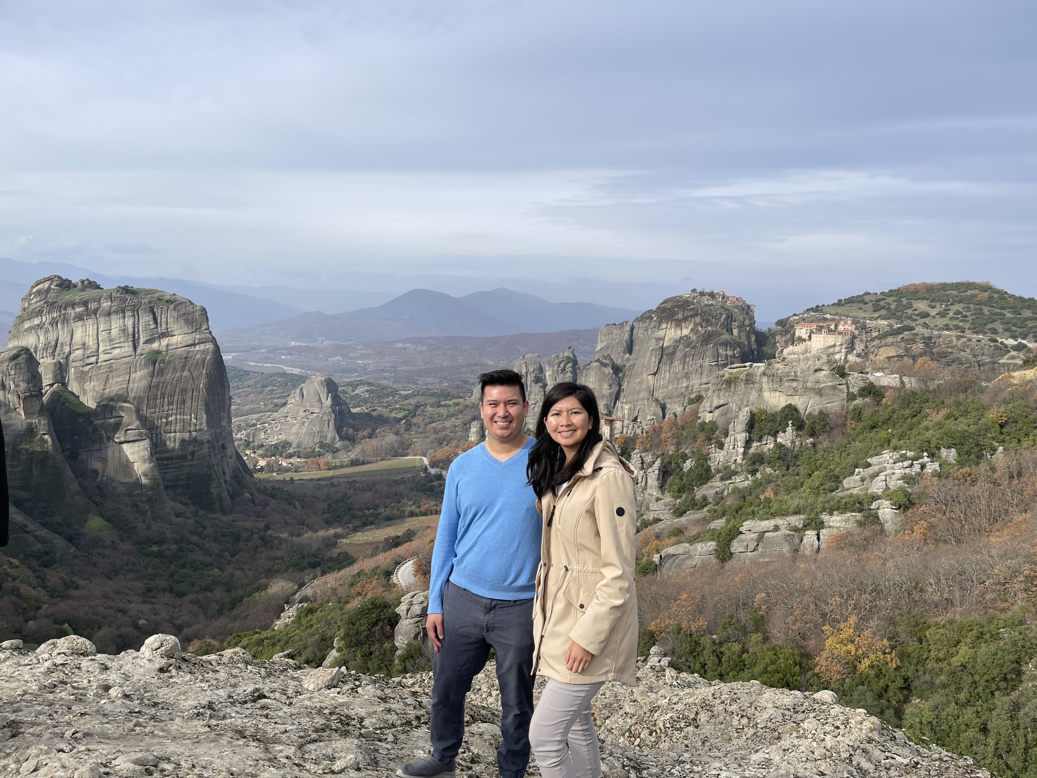 Janice and Julius standing in front of Meteora's surrounding landscape of rolling rock formation and Hol Monastery of Grand Meteoron