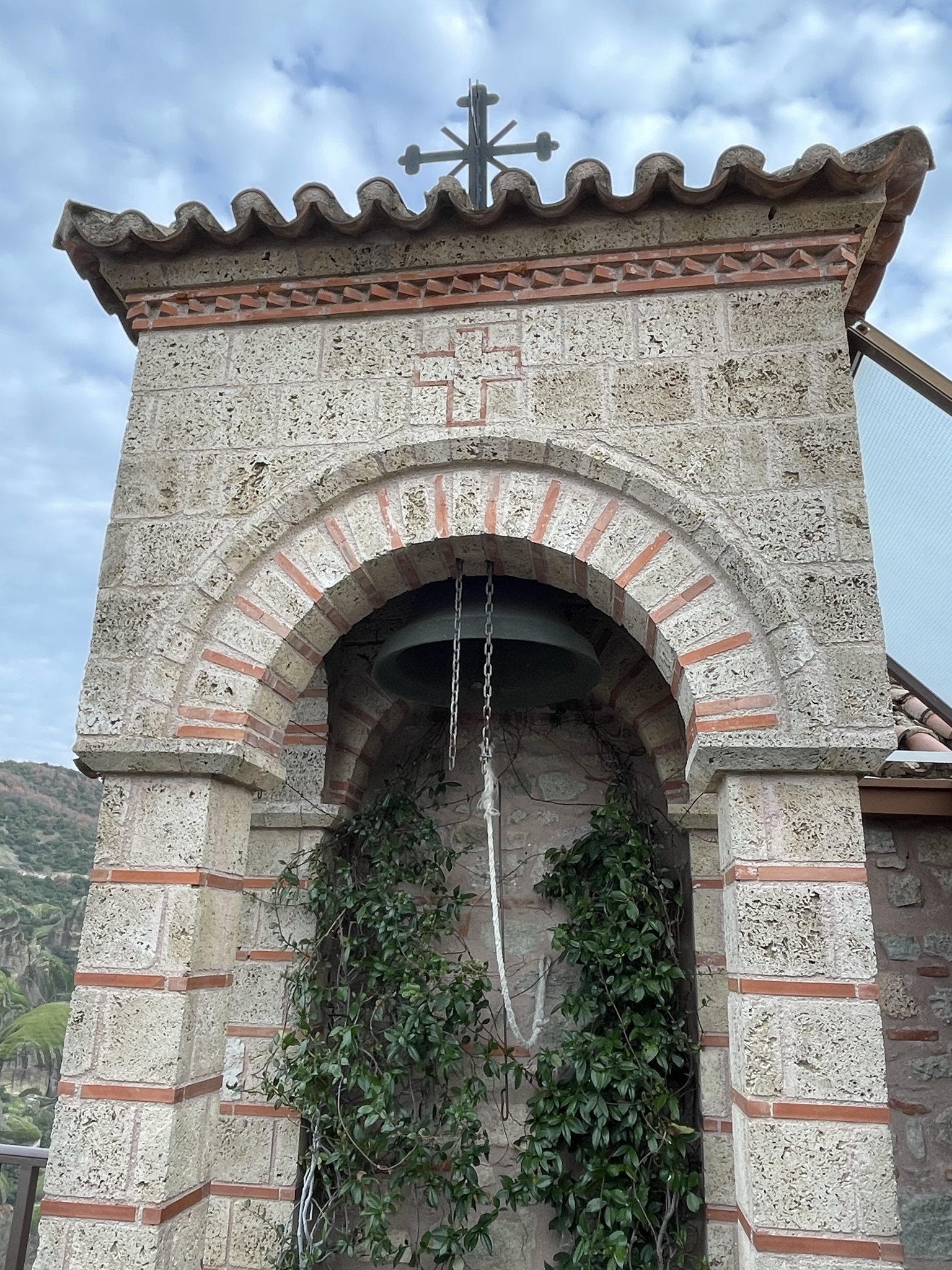 The bell in cased in a stone structure with a red cross engraved in the wall and a metal cross on top
