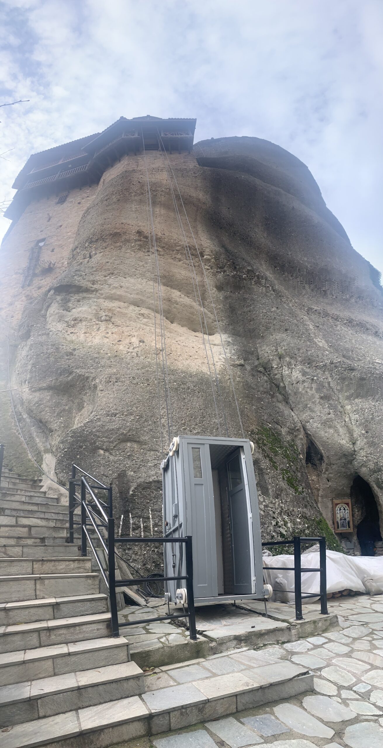 The elevator is next to the flight of stairs that lead to the Saint Nikolas Monastery
