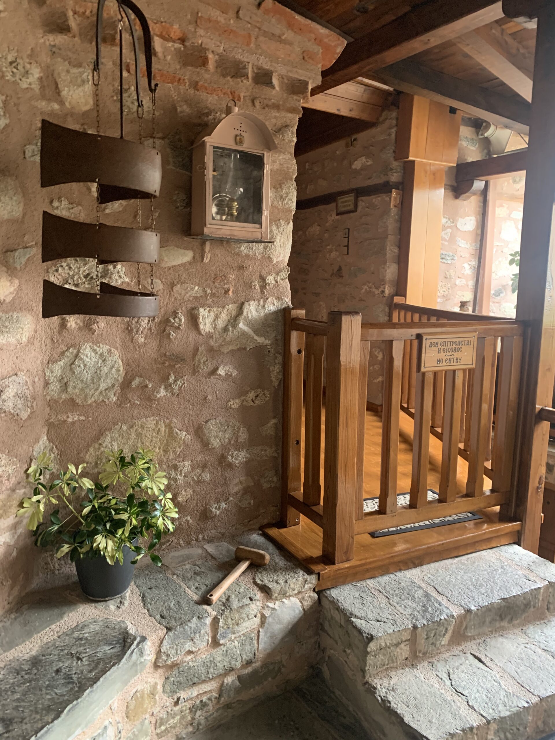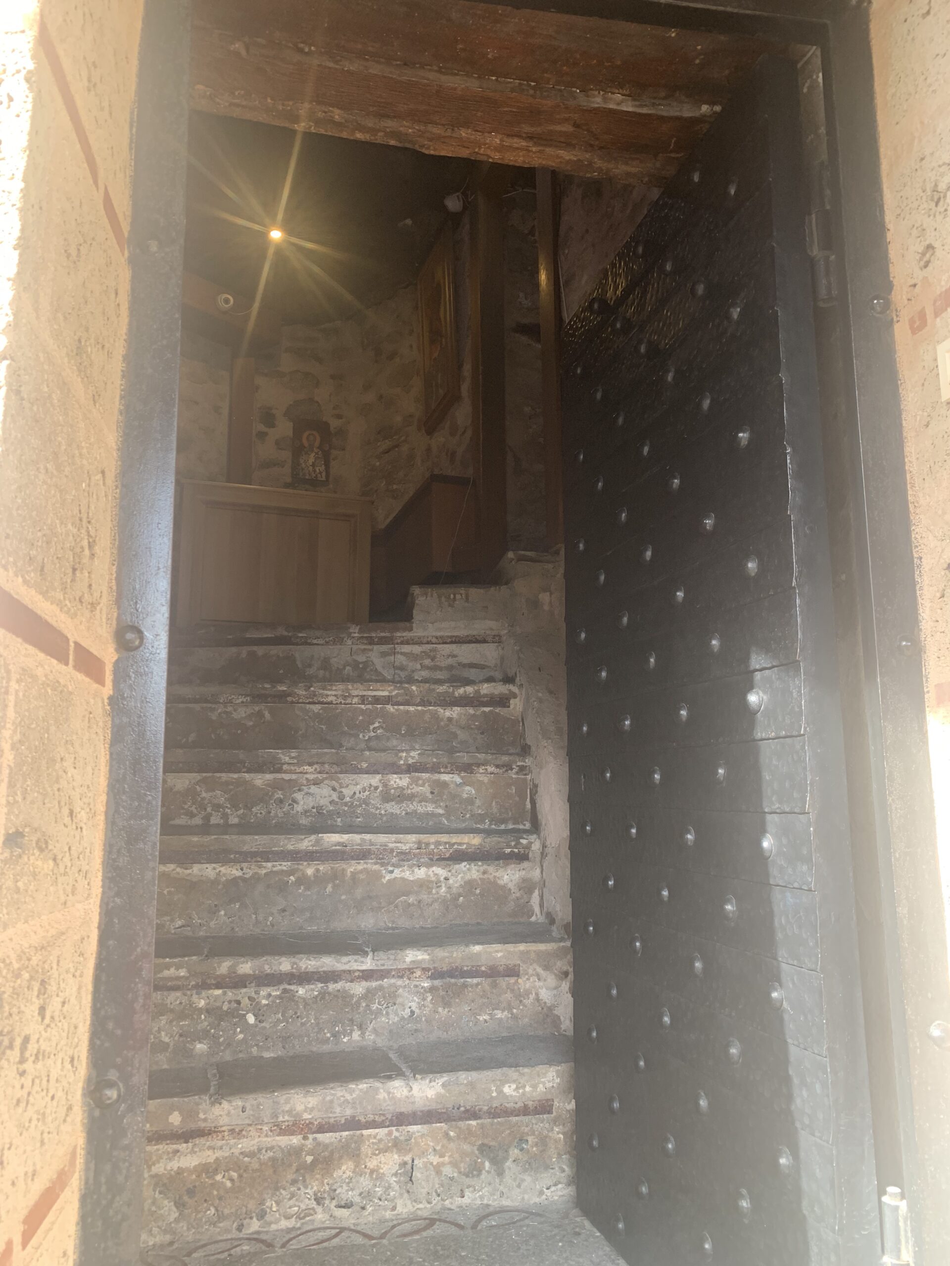 After a few more steps, we made it to the top and paid 3 euros a person to enter the monastery. Inside, we saw the gift shop and then headed into the church, where photos and videos were prohibited. Then, we walked around the courtyard and saw a bell with a cross on top. The monastery was small and there wasn’t much to see. We spent 30 minutes (15 minutes to view the monastery and 15 minutes to walk up and down the steps).
