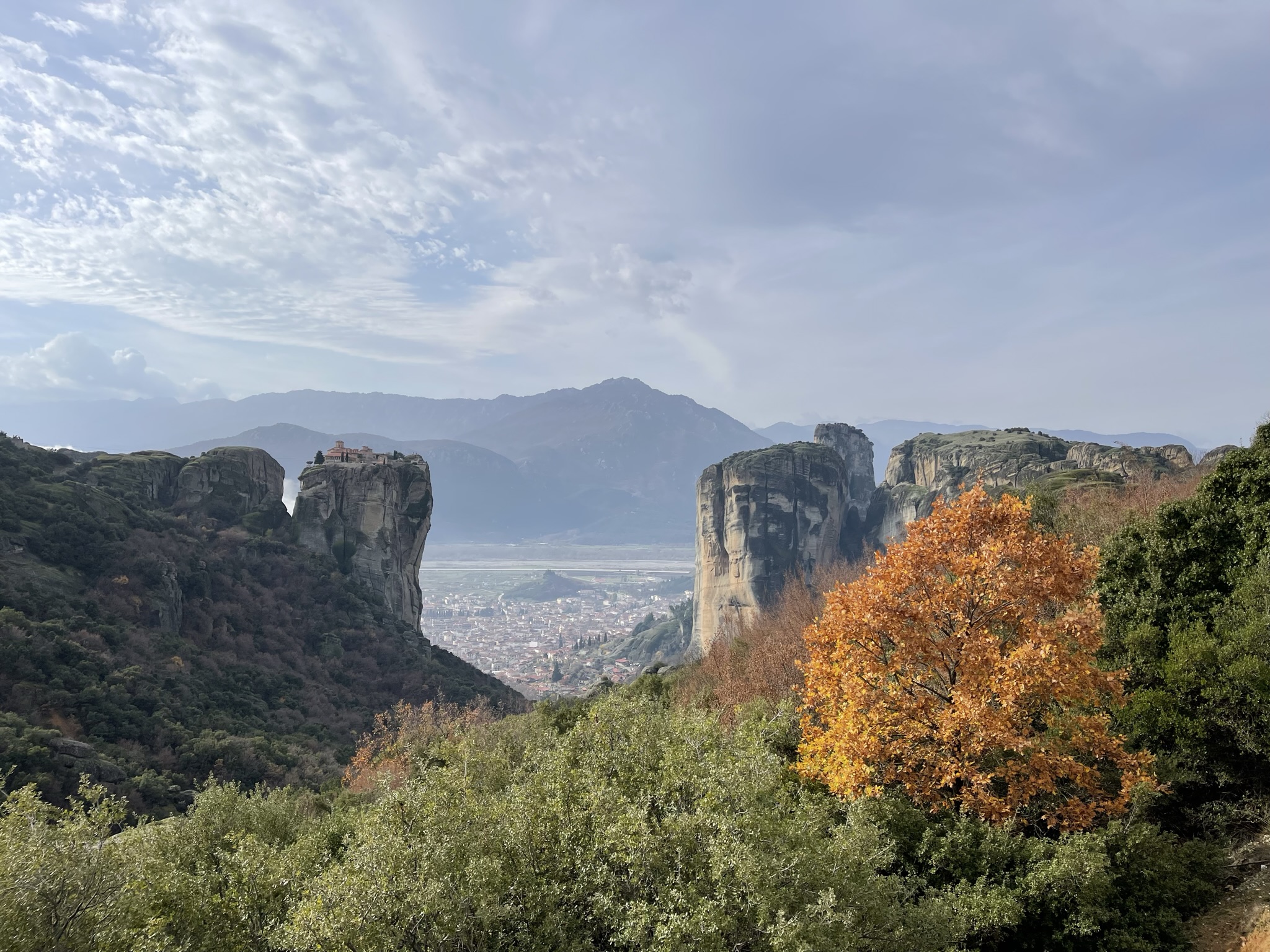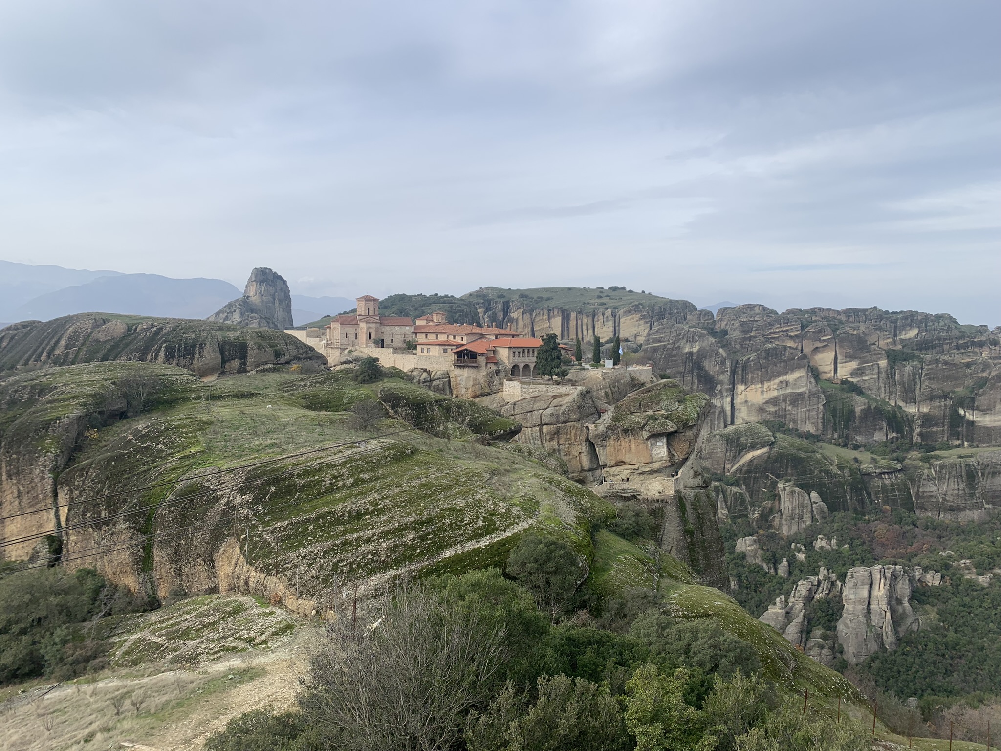 Meteora rocks can be seen from a viewpoint at Saint Nikolas Monastery