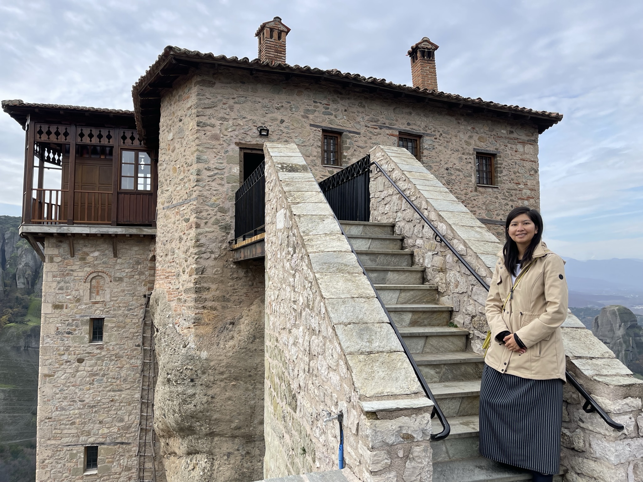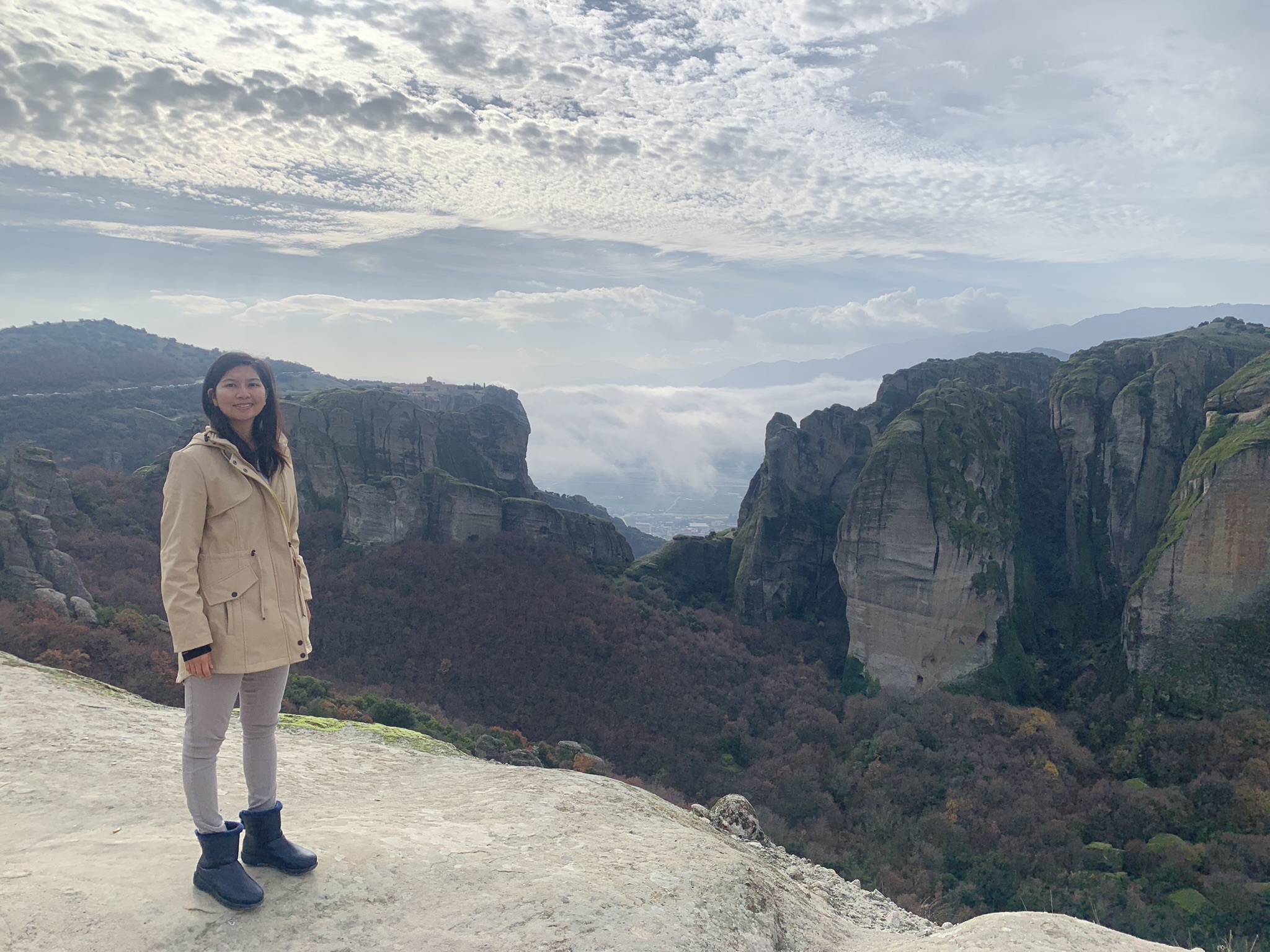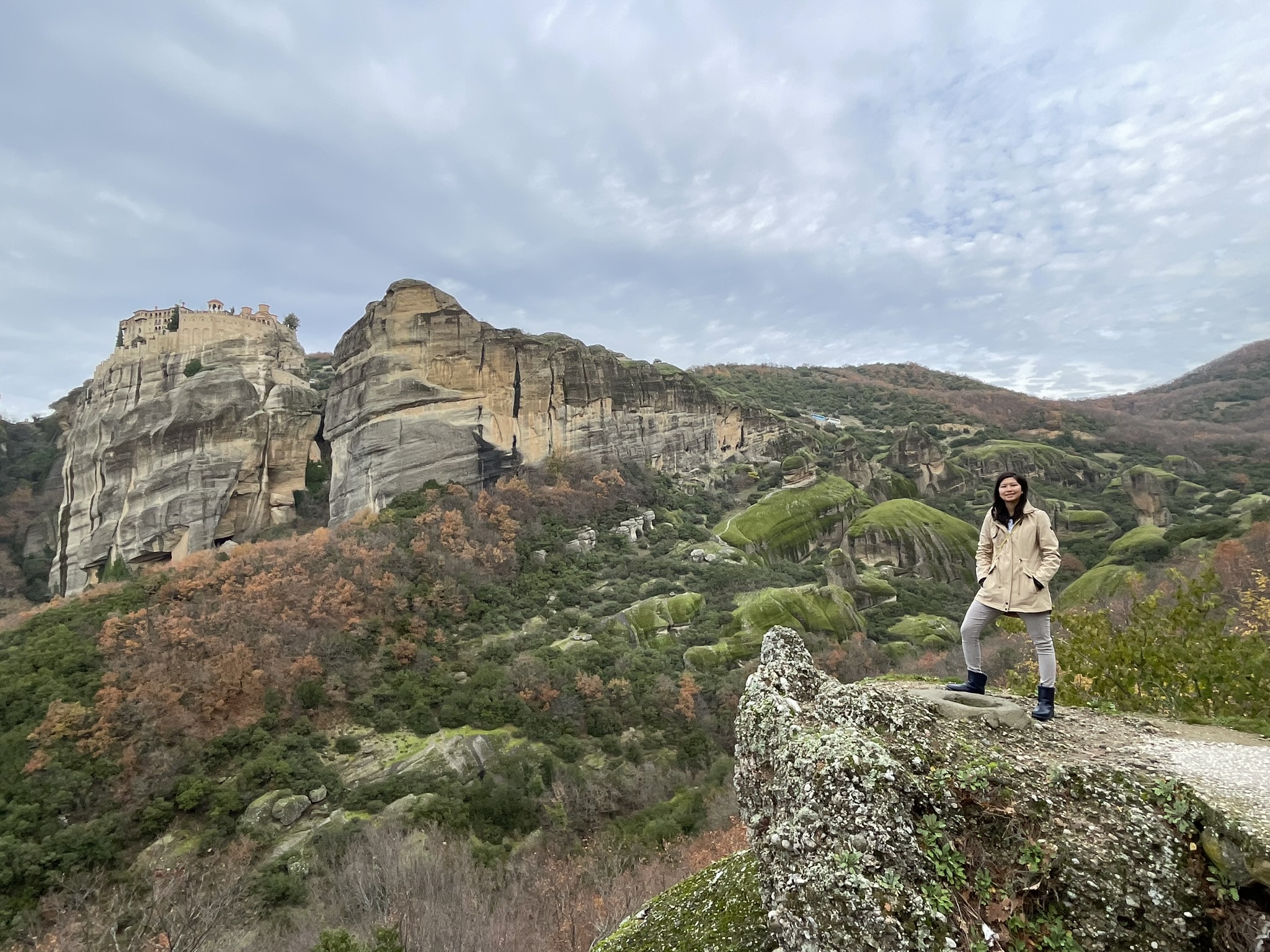Janice posing in front of Meteora’s surrounding landscape of rolling rock formations and monasteries