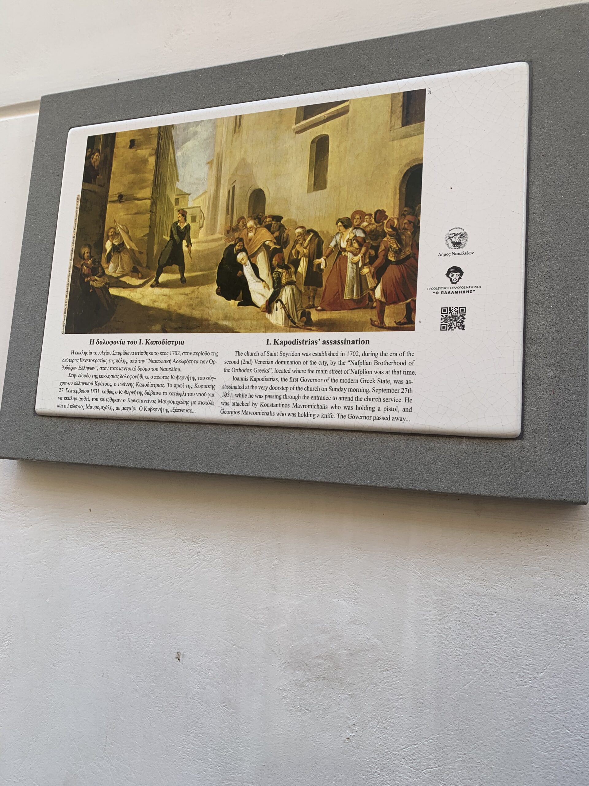 Situated in the historic Old Town of Nafplio, the Church of Saint Spyridon is notable for its association with the assassination of Ioannis Kapodistrias, the first governor of Greece. You can discover the story behind the tragic event at this site. Remarkably, the bullet mark left by Kapodistrias’ attackers remains visible outside the church to this day. The bullet mark is preserved in a brass and glass casing situated on the right-hand side of the entrance.