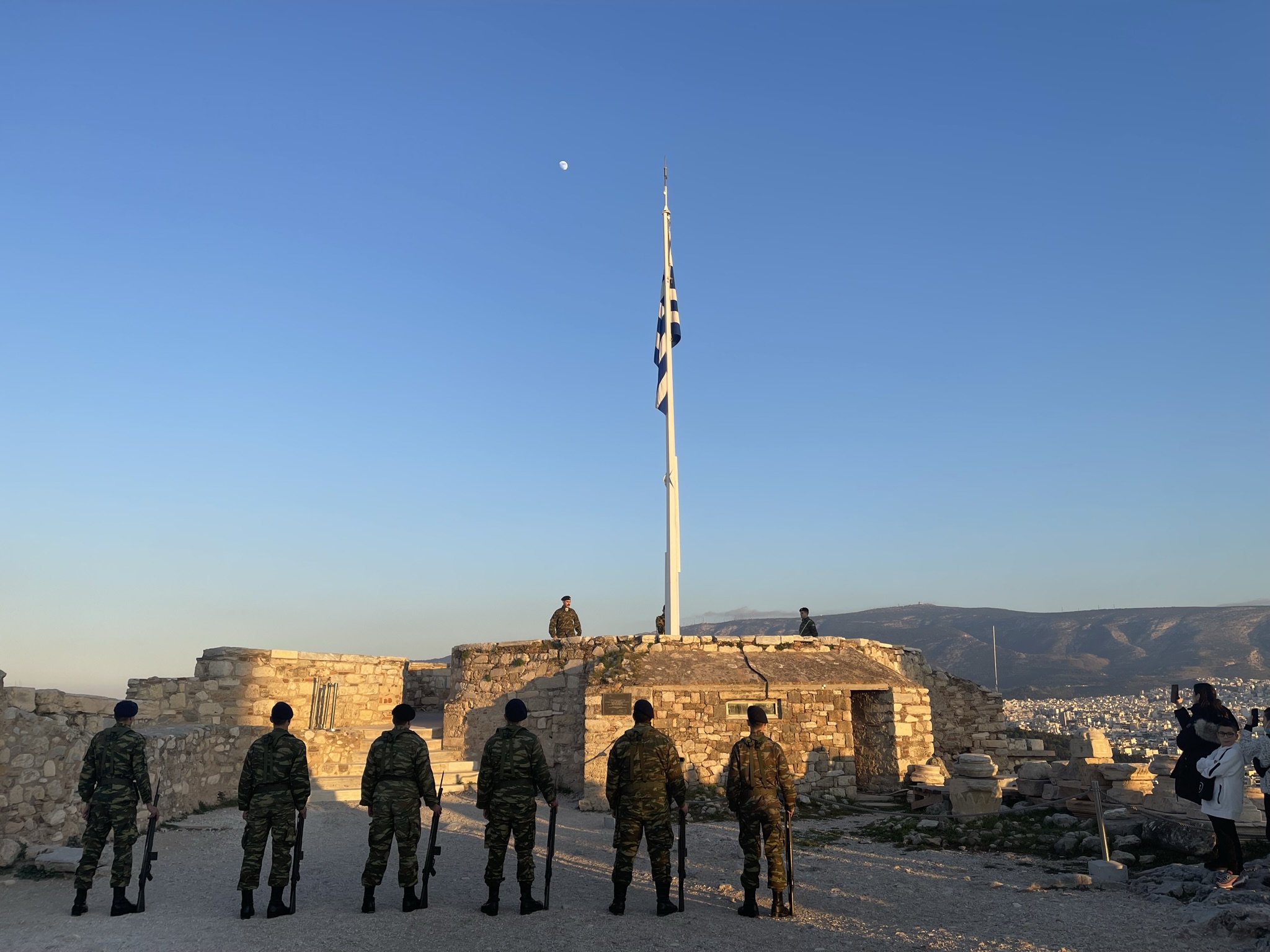 One of the most unexpected highlights of our visit was spotting a group of guards. As we were taking pictures of the Parthenon at 4:44 PM, nine soldiers suddenly appeared, marching in perfect formation. Curious, we followed them to the flagpole, where they lined up in a precise display of discipline. It was fascinating to watch them move in sync as they ceremoniously lowered the Greek flag, adding a memorable moment to our visit.