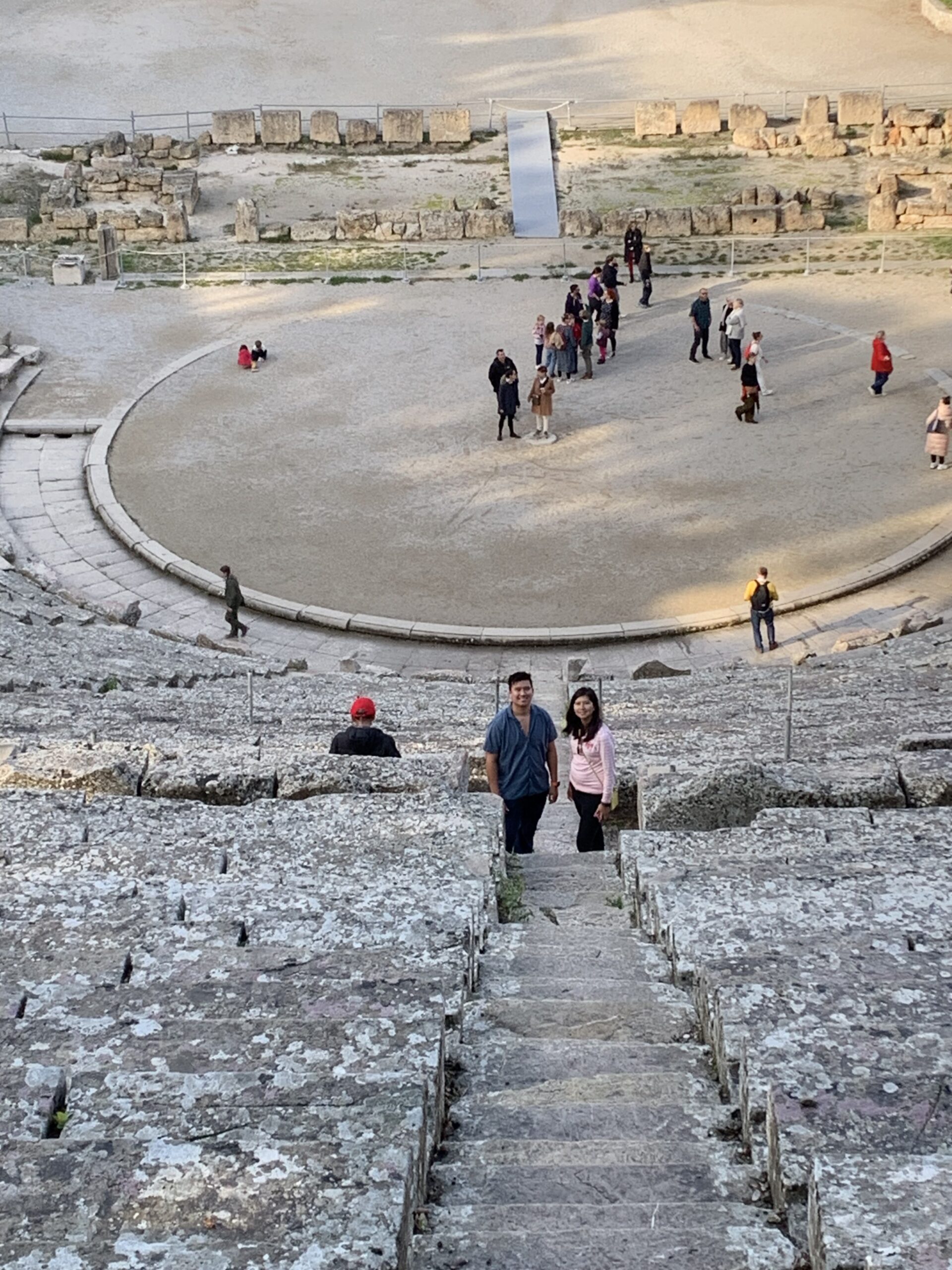 I walked up to the top of the theater and then sat down to take a break. While I was resting on the seats, I saw some people testing the acoustics by clapping their hands at the bottom of the theater, and their friends were at the top of the theater clapping their hands. It was fun to watch and listen.