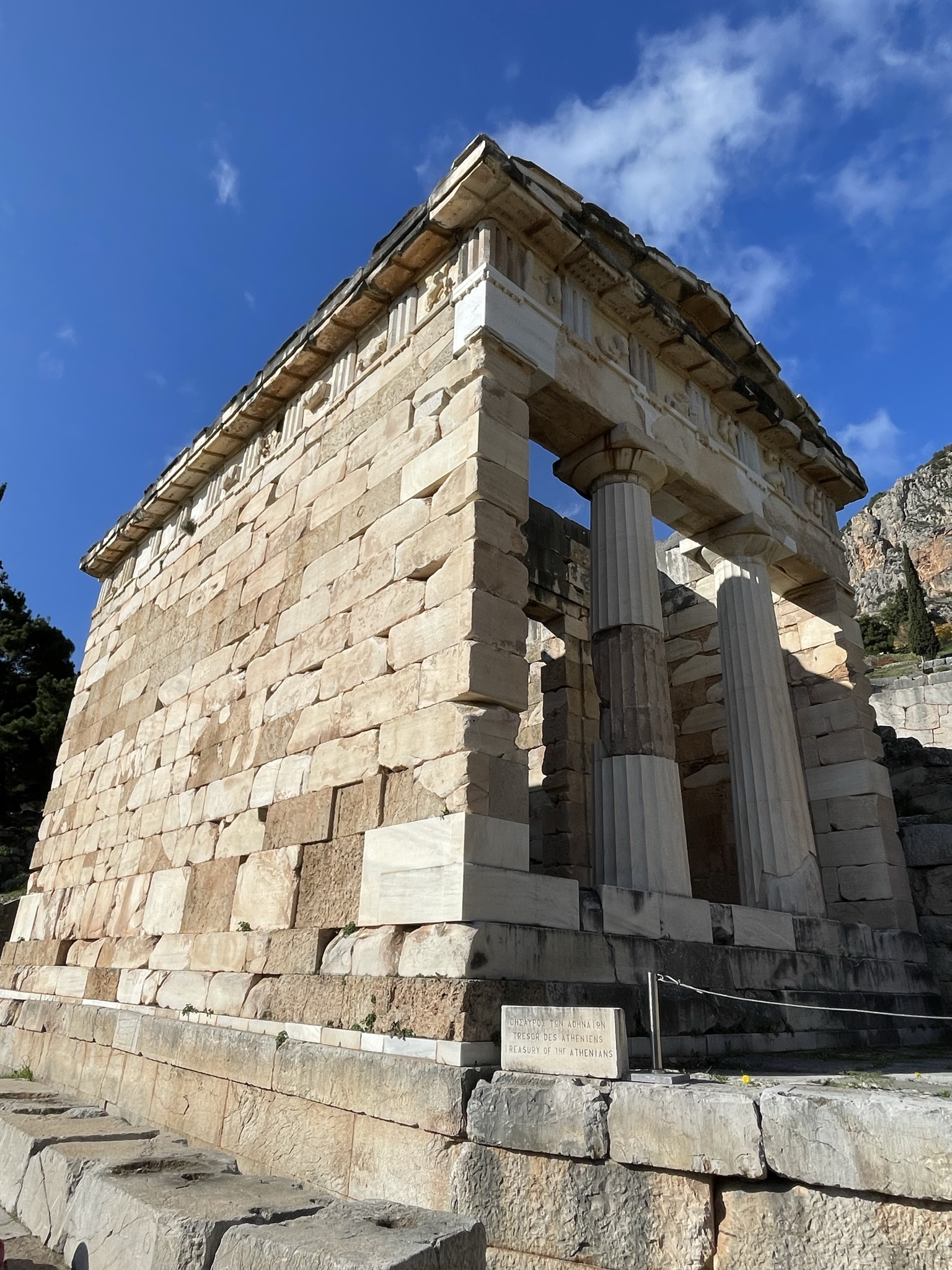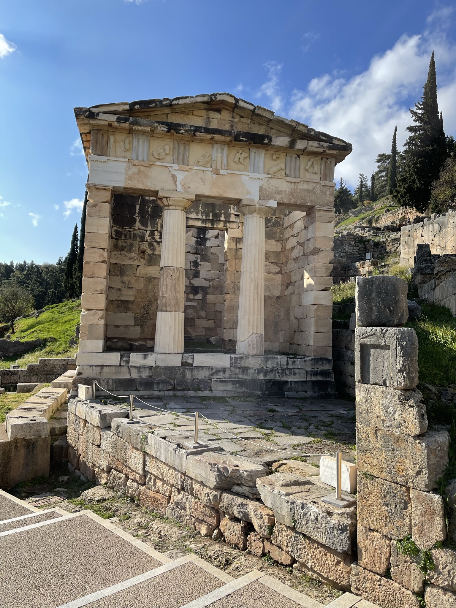 After story time, we got up and followed the sacred way to visit the Treasury house of Athenian. The tour guide mentioned that it has been restored since they found 80% of the original materials. The treasury house was built by Athenians to serve as a repository for valuable offerings such as precious metals, sculptures, and other valuable items. It served as a symbol of Athens’ wealth and power, as well as their devotion to the gods.