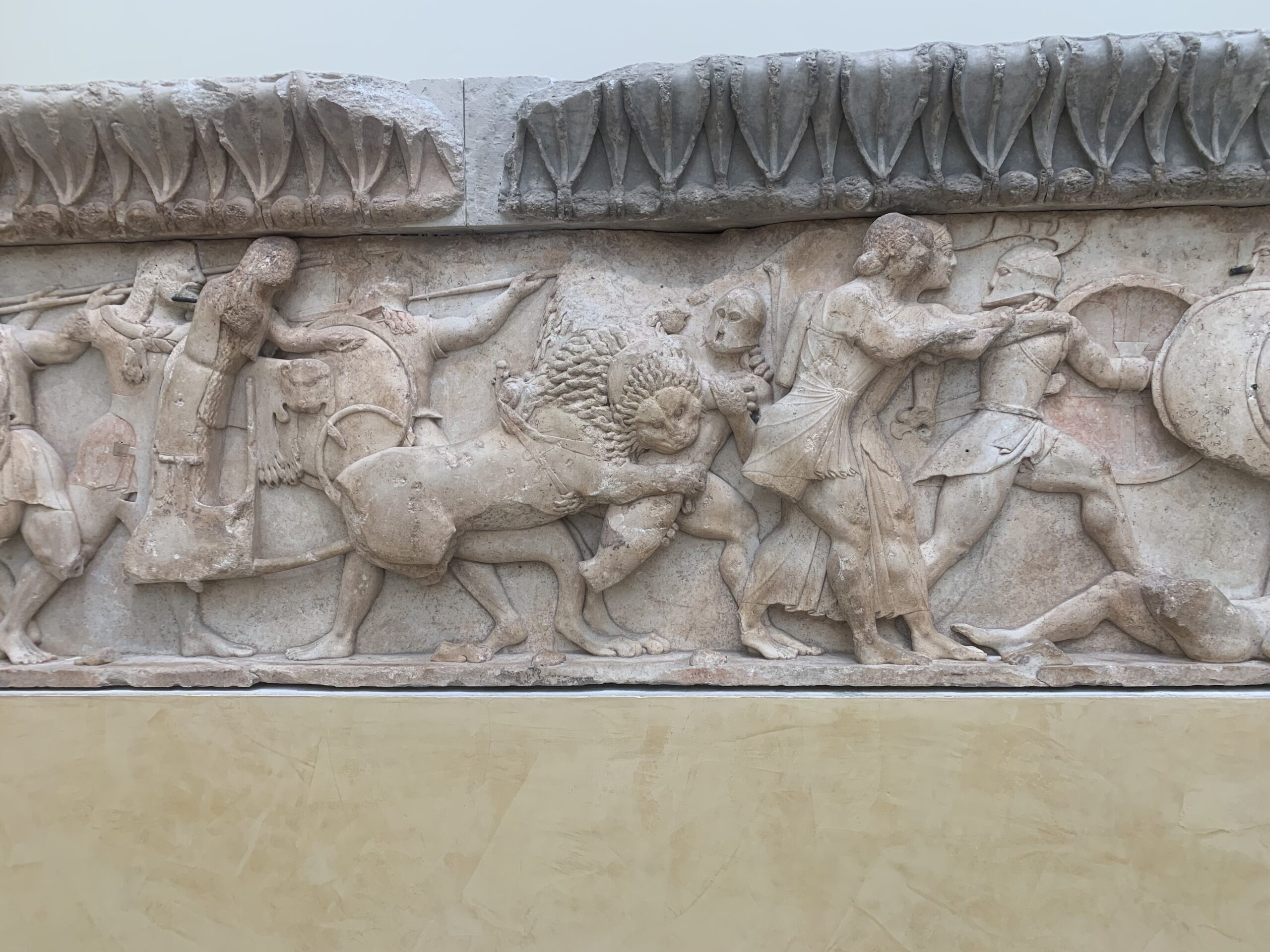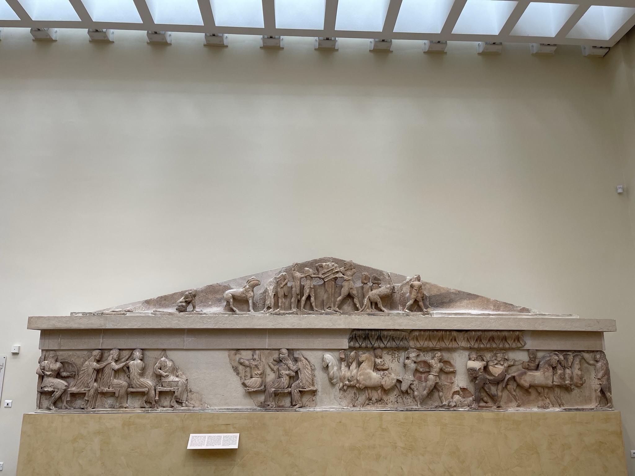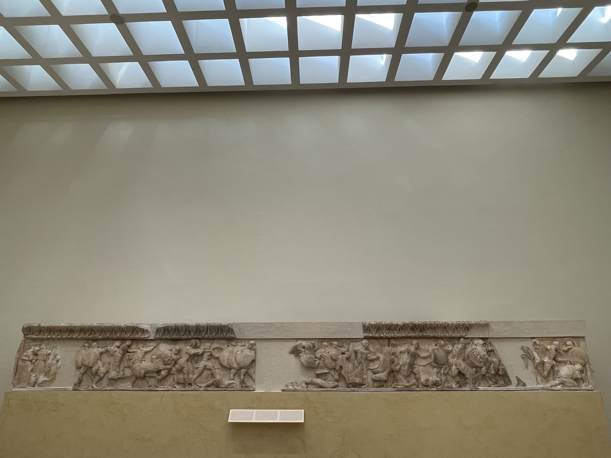 On the other side of the room, I read about the east pediment which depicts a famous Delphic Theme and the east frieze which showed a scene from the Assembly of the Gods during the trojan war, where the gods are discussing the issue with lively gestures like they are arguing. I also read about the north frieze which depicts the Battle of the Giants. It symbolizes the triumph of order and civilization over savagery, barbarism and anarchy.