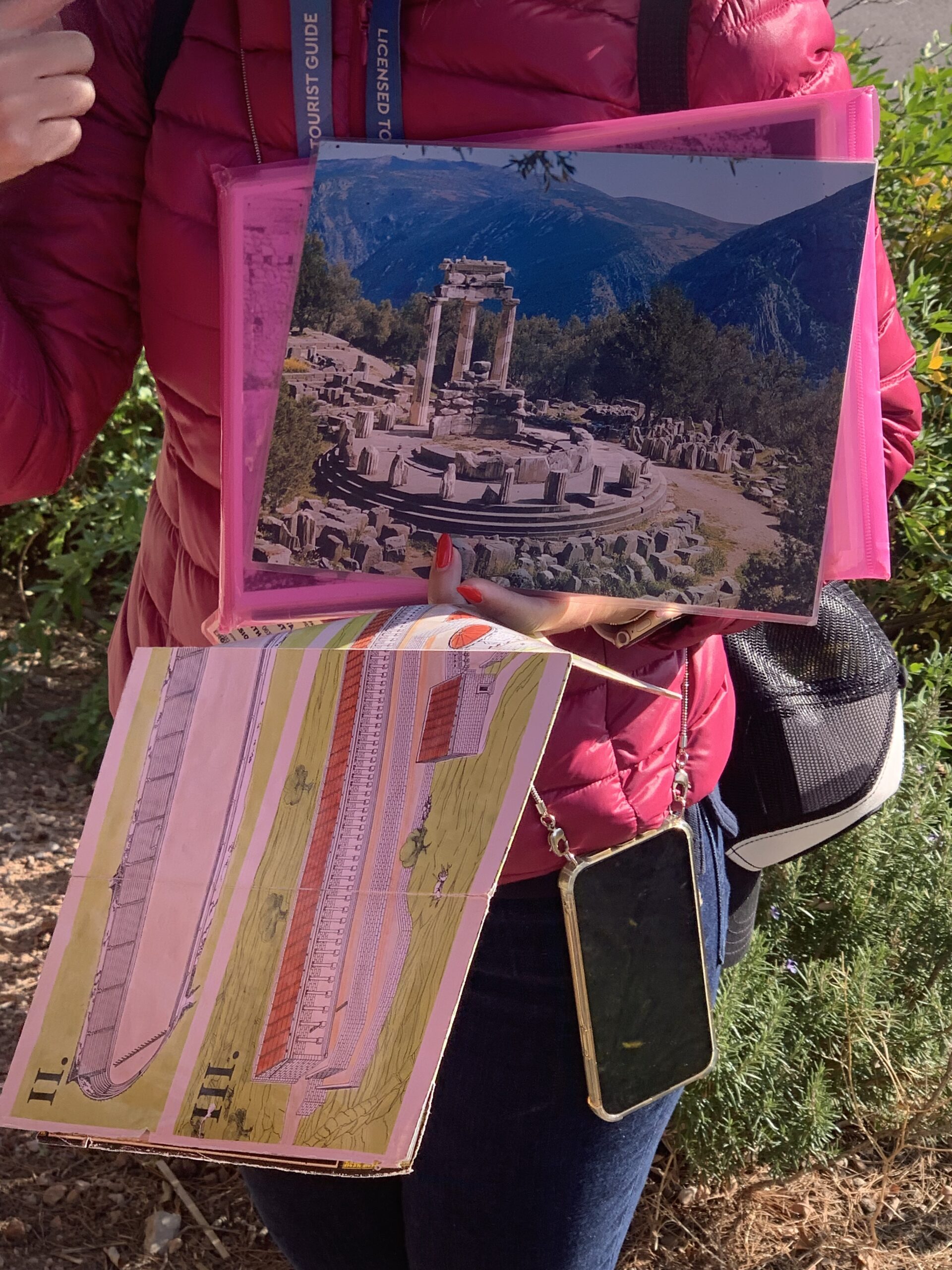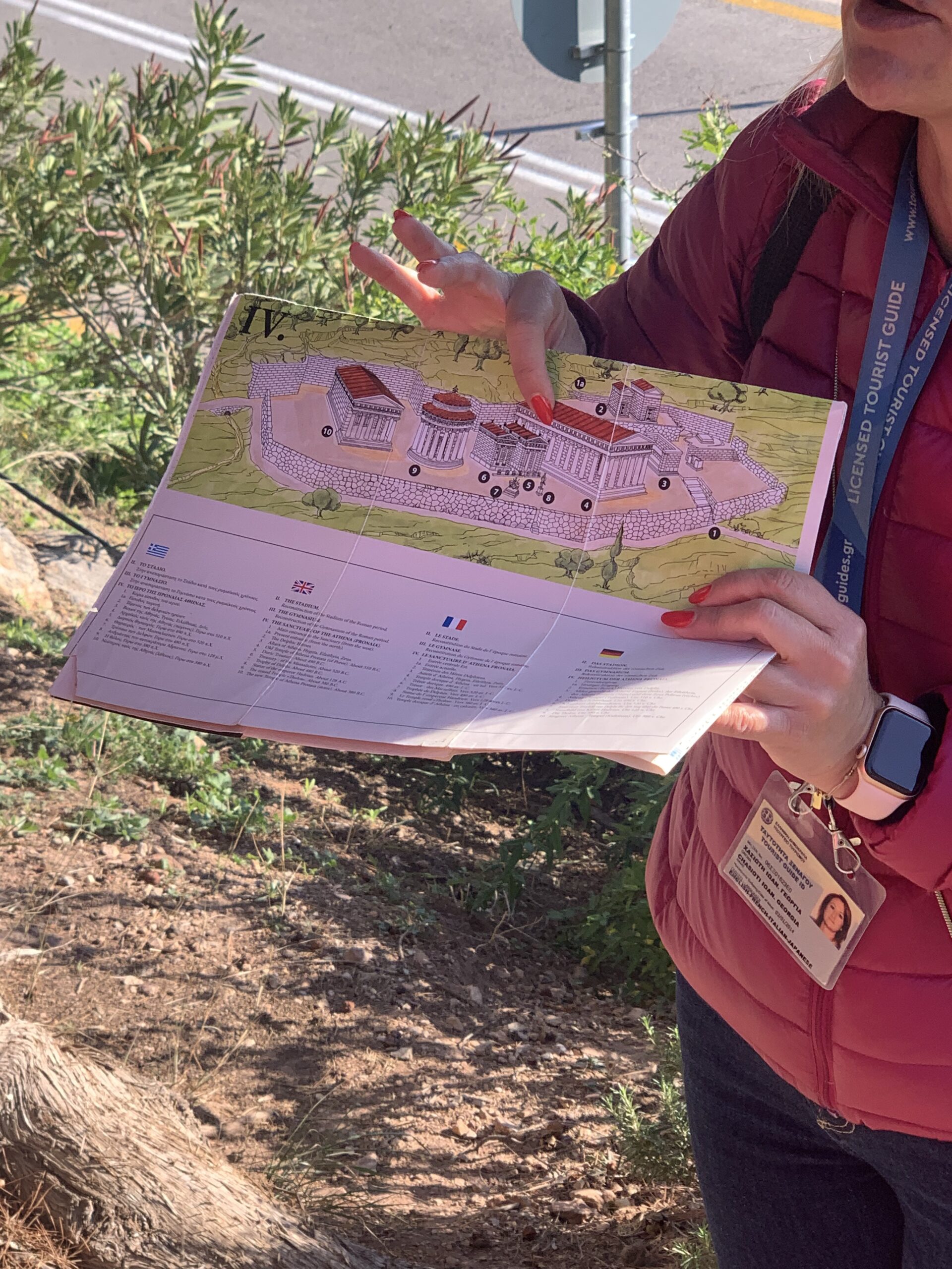 As we began our walk to the Delphi Archaeological Site, the tour guide explained that the archaeological site included two sanctuaries: one dedicated to Apollo and the other dedicated to Athena. The site at the bottom of the hill was the sanctuary of Athena. Unfortunately, the tour guide said we won’t have enough time to visit the sanctuary of Athena, but she showed us the map of the sanctuary, which included five main buildings: the Old temple of Athena Pronaia, Doric Treasury, Tholos (aka Circular Temple), and the Priests House.