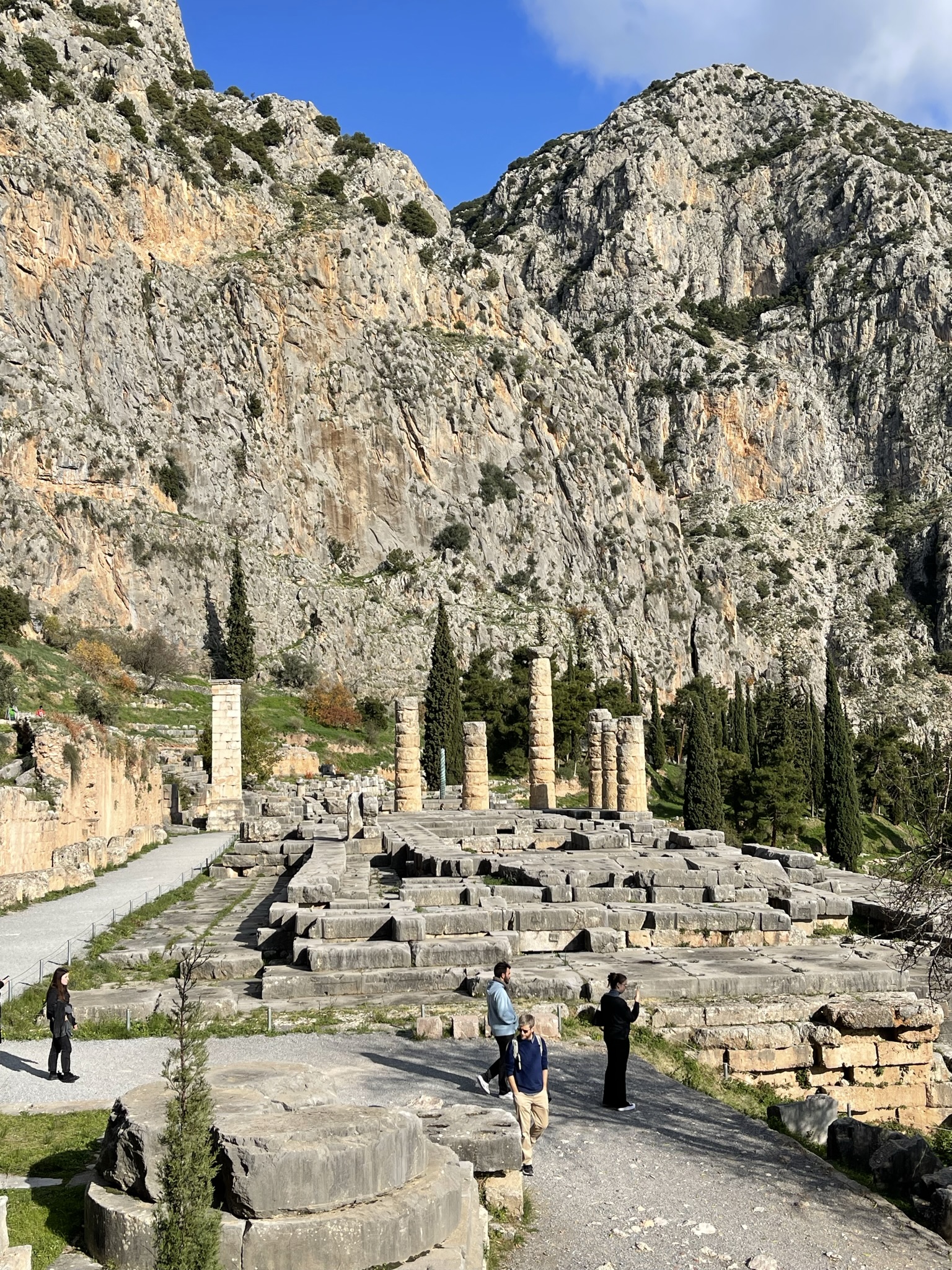 The tour guide informed us that the Priests from Knossos (Crete) brought the cult of Apollo to Delphi in the 8th century BC, and began the construction of the sanctuary to the god. The sanctuary was always crowded until it was eventually abandoned in the 4th century AD due to landslides that caused the buildings to collapse.